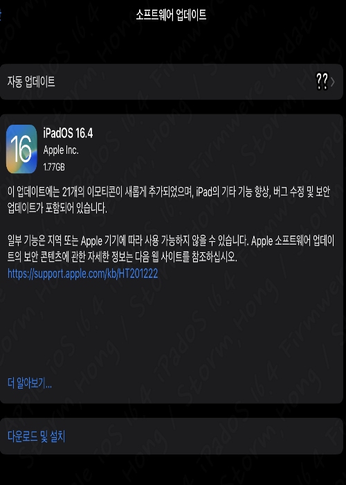 iPadOS 16.4 설치 공간은 약 1.77 GB 입니다. (설치용량은 각 이전에 업데이트하지 않으신분들은 더큰 용량일수있습니다.)이전의 iPadOS 16.3 이하 업데이트를 하지 않으신 분들은 한꺼번에 설치해야 하므로 용량이 클 수 있습니다.