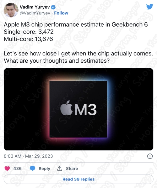 A17 Bionic 프로토타입 버전의 성능 번호를 공유했으며, 칩은 Geekbench 6 의 멀티코어 결과에서 A16 Bionic 보다 43% 빠르다는 정보도 나나났으며, 현재 예상, 예측, 루머, 소문의 정보라는 점입니다. 그렇듯이 이번 Vadim Yuryev 는 M3 의 인상적인 숫자를 공유하며, 적어도 상업 단위가 동일한 결과를 보여줄 것으로 보이는 만큼 신중하게 이에 대한 정보를 지켜봐야 할 것으로 보입니다.