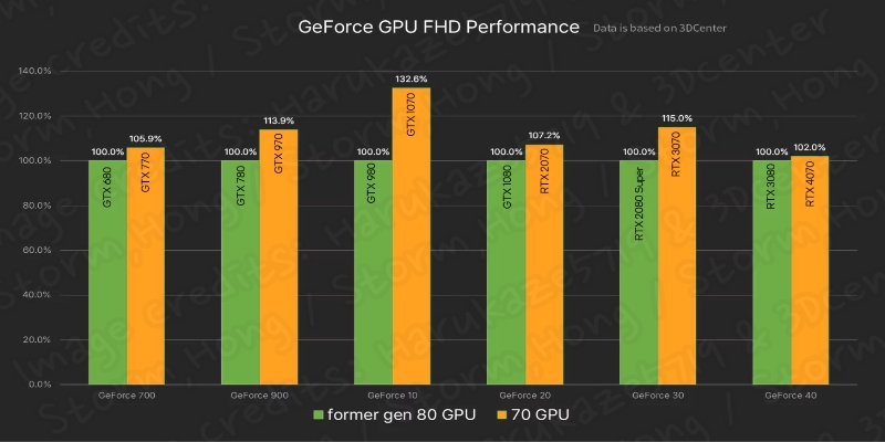 이에 대해 카드가 잘 팔리지 않는 이유로 일부는 가격 인상과 이전 세대 대비 성능 저하가 원인일 수 있다는 예상, 예측, 루머, 소문의 정보를 전했습니다. 또한 NVIDIA GeForce RTX 4070 GPU는, 플래그십에 버금가는 성능을 보여 주었습니다. 그러나 이번 NVIDIA GeForce RTX 4070 은 NVDIA GeForce RTX 3080 에 비해 퍼포먼스가 많은 상승을 보여주지 않았습니다. 반면, NVIDIA GeForce RTX 3070 의 MSRP USD 499 ($) 로 소매가격인 NVIDIA GeForce RTX 2080Ti 보다 동등하거나 앞서는 상황이 있어 판매가 좀 더 이루어졌습니다.