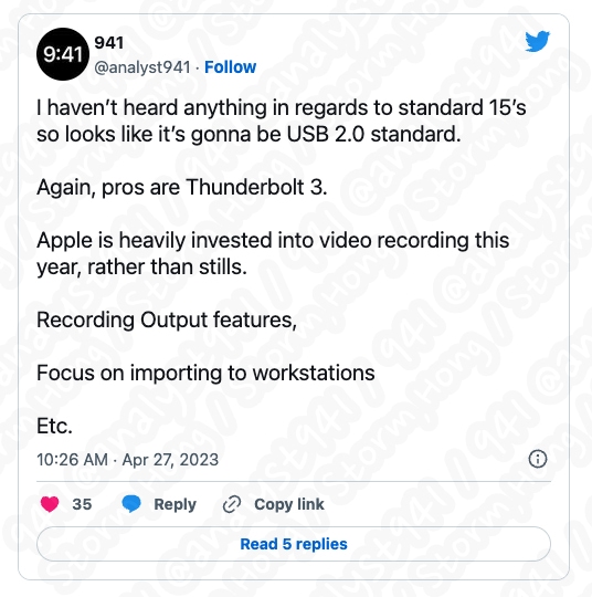 'iPhone 15 Pro Series' 모델이 애플 썬더볼트 3 USB-C 포트를 갖춘 Apple 의 유일한 아이폰 덕분에 iOS 17 에서 잠금 해제 기능을 얻을 것이라고 보고한 직후, @analyst941은 트위터에서 회사가 비디오 녹화에 '심히 투자'하고 있다고 말한다. 고해상도와 고프레임레이트 비디오를 캡처하는 것은 항상 아이폰의 강점이었지만, 애플은 '녹화 출력' 기능을 도입하여 기준을 높이고 있습니다.
