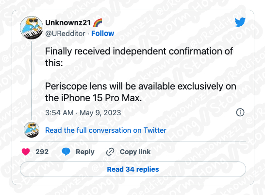 @UReditor 의 트윗에 의해 알려진 정보에 의하면, 현재 iPhone 15 Pro Max 에만 잠망경 줌 랜즈를 탑재할 것으로 보인다는 정보가 나타났습니다. 이 예상, 예측, 루머, 소문의 정보는 2022년부터 나오고 있던 내용이었습니다. 이 iPhone 15 Pro Max 의 잠망경 줌 랜즈를 통해 가격 상승 등 여러 가지 요소가 있을 수 있다는 이야기도 나오고 있는 만큼 아직 정확한 가격등 사양이 나타나지 않은 만큼 조심스럽게 접근해야 할 수도 있는 내용이기도 합니다.