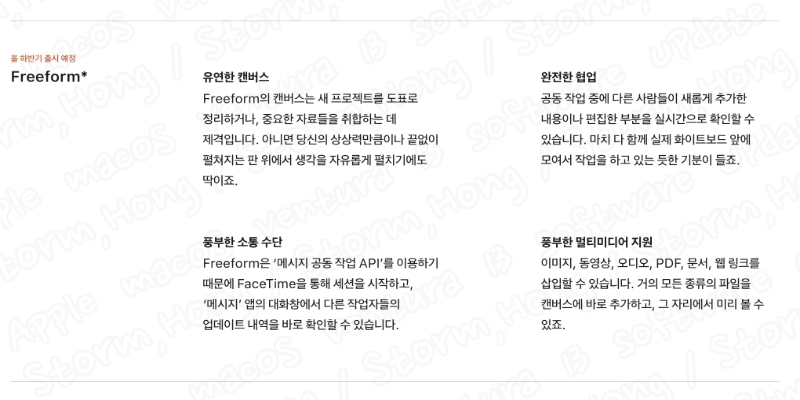 Freeform 앱은 iPad를 사용할 때 Apple Pencil 을 완벽하게 지원하는 FaceTime 을 통해 실시간으로 협업할 수 있는 유연한 디지털 캔버스를 제공합니다. 사용자는 이미지, 메모, 낙서, 문서, 웹 링크, PDF 등을 추가하고 콘텐츠를 추가하거나 편집할 때 다른 사람의 기여를 볼 수 있습니다. 2022년 10월 24일 (EDT) 에는 사용을 할 수 없으며, 추후 업데이트 예정 (2022년 12월 13일 EDT) 에 업데이트 진행되었습니다.