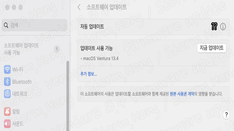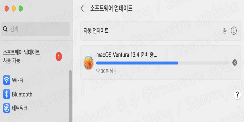 ↑ 기존 macOS Ventura 13.4 에서 설치 시작 시 실제로 위 사진처럼 2.07 GB 로 설치 용량이 늘어납니다. 따라서 설치가 덜되어 있는 분들은 더 클 수 있습니다. 따라서 macOS Ventura 13.4 업데이트 시에도 설치 공간은 예상치 보다 더 많이 필요할 수 있습니다.