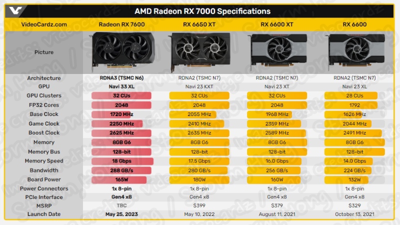 AMD Radeon RX 7600 8GB 는 보급형 RDNA 3 GPU 를 기반으로 하는 주류 그래픽 카드로 예상, 예측, 루머, 소문으로 알려졌습니다.  이 RDNA 3 GPU 는 Navi 33 기반의 칩을 사용할 것으로 알려져 졌으며, 6nm 모놀리식 설계를 활용하는 제품군 중 가장 작고 유일한 칩이 될 것으로 보인다는 정보가 나타났습니다. 몇 달 동안 칩의 핵심 구성에 대해 정보가 있었지만 Videocardz 에 따르면 RG 에서 공식 사양이 나타났습니다.