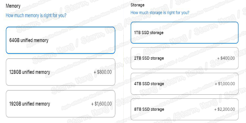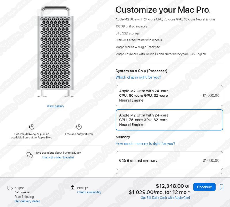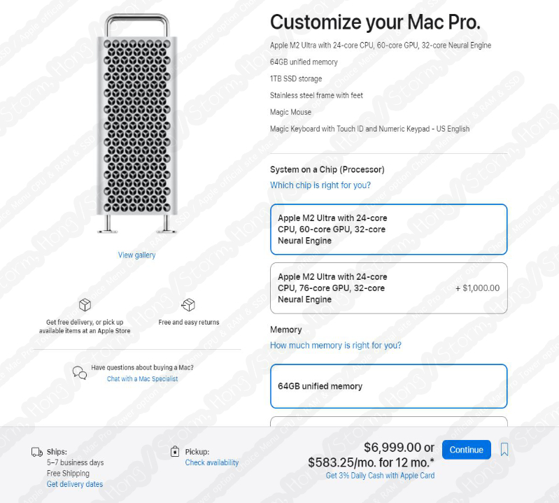 * M2 Ultra Mac Pro 타워형 미국 공식 홈페이지 기준, 기본 제품의 경우 USD 6,999 ($) 추가 옵션에 따라 가격이 달라질 수 있으며, 최고 옵션으로 구매 시 USD 12,348. ($) 입니다.