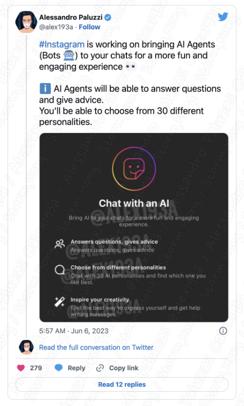 알려진 예상, 예측, 루머, 소문에 따르면, 리버스 엔지니어 Alessandro Paluzzi 가 공유한 Tweet 의 스크린샷을 바탕으로 instagram (인스타그램) 은 AI ChatBot 과 대화할 수 있는 기능을 개발 중인 것으로 보인다는 예상, 예측, 루머, 소문의 정보를 전했습니다. 해당 ChatBot 은 질문에 답하고 조언을 해줄 수 있으며, 30 가지의 AI 성격을 가진 프로그램과 대화를 나누며 자신이 가장 좋아하는 것을 고를 수도 있습니다. 만약 사용자가 자신을 표현하는 데 어려움을 겪는 사용자라면, 실제로 ChatBot으로부터 도움을 받아 메시지를 작성할 수도 있습니다.