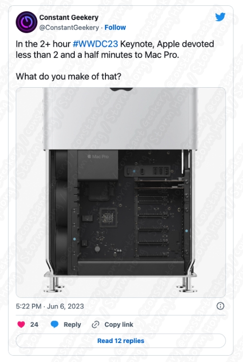 WWDC 2023 발표는 2시간 넘게 진행했습니다. 이에 많은 이가 기대하단 Mac Pro 제품이 드디어 예상, 예측, 루머, 소문의 정보를 얼마나 충족시켜 줄지 많은 이가 기대하는 제품인 만큼 기대를 받고 있었습니다. 또한 이 제품이 Apple Silicon 으로 전환되는 마지막 제품이자, 처음 Mac Pro Series 에 적용하는 만큼 큰 의미를 가지고 있습니다. Constant Geekery 는 자신의 Tweet 을 통해 M2 Ultra 를 적용한 Mac Pro 는 WWDC 2023 에서 많은 기대를 가지고 지켜보든 이들에게 아쉬움을 남겼으며, 시간은 2분 30초 ~ 3분 미만이었기에 더욱더 실망할 수밖에 없는 요소가 되었습니다.