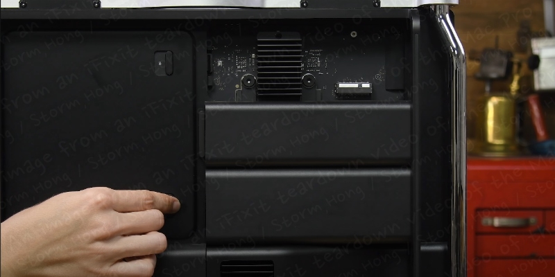 iFixit 의 영상에서 분해를 위해 전작인 intel Mac Pro 와 마찬가지로 상단에 있는 핸들을 사용하여 케이스에서 제거 후 알루미늄 뚜껑을 열어 내부를 공개했습니다. 공개된 내용처럼 내부는 간단해 보였우며, 업그레이드를 하는 것은 추후 문제이며, 또 다른 내용이 될 것이라는 정보를 전했습니다.