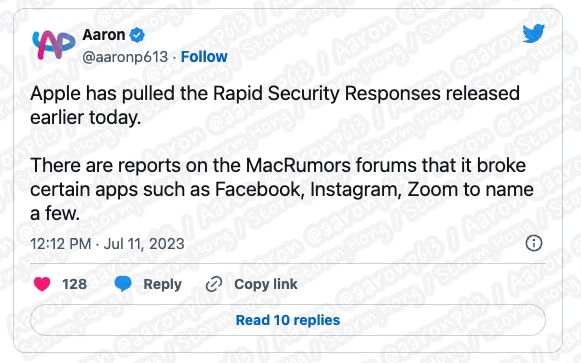 이는 특정 웹사이트가 작동하지 않는 문제로 인해 소프트웨어 설치를 하지 않도록 조치했다는 정보입니다. MacRumors 포럼에서 알려진 내용에 따르면, Facebook , Instagram, WhatsApp, Zoom 및 기타 웹 사이트 중 일부가 RSR (Rapid Security Response) 업데이트 이후 Safari 브라우저에서 지원되지 않는다는 경고 메시지등 여러 가지 버그를 보였습니다.