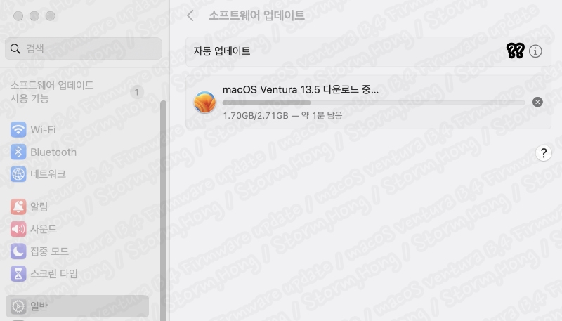 ↑ 기존 macOS Ventura 13.5 에서 설치 시작 시 실제로 위 사진처럼 2.71 GB 로 설치 용량이 늘어납니다. 따라서 설치가 덜되어 있는 분들은 더 클 수 있습니다. 따라서 macOS Ventura 13.5 업데이트 시에도 설치 공간은 예상치 보다 더 많이 필요할 수 있습니다.