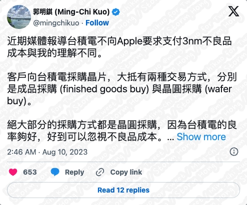 Apple 은 TSMC의 3nm 수율이 55% 에 불과하다는 예상, 예측, 루머 소문에 대해 불량 금형보다 좋은 금형의 가격만 지불할 것으로 보인다는 정보가 나타났습니다. 이 내용에 대하여, Ming-Chi Kuo 애널리스트는 두 회사의 깨지지 않는 비즈니스 관계에도 불구하고 TSMC 의 불량 웨이퍼의 손실을 처리하고 있지 않는다는 정보를 Tweet 을 통해 예상, 예측, 루머, 소문의 정보를 전했습니다. Ming-Chi Kuo 는 기업들이 TSMC 로부터 칩을 완제품이나 웨이퍼 구매 형태로 구매한다는 내용을 전했습니다.