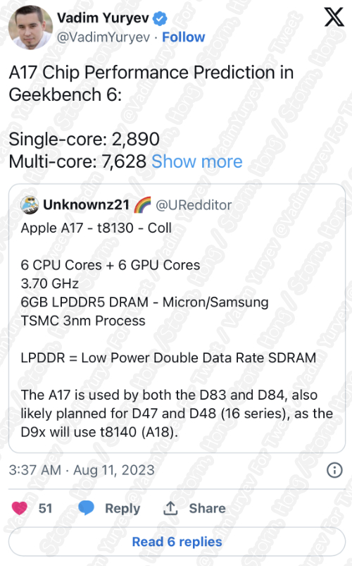 *앞서 설명한 정보는 YouTuber , Twitter 사용자 Vadim Yuryev 에 의해 나타났으며, Geekbench BenchMark 측면에서 A17 Bionic 칩으로 사용자가 기대해야 하는 것에 대한 자신의 생각을 공유했습니다.