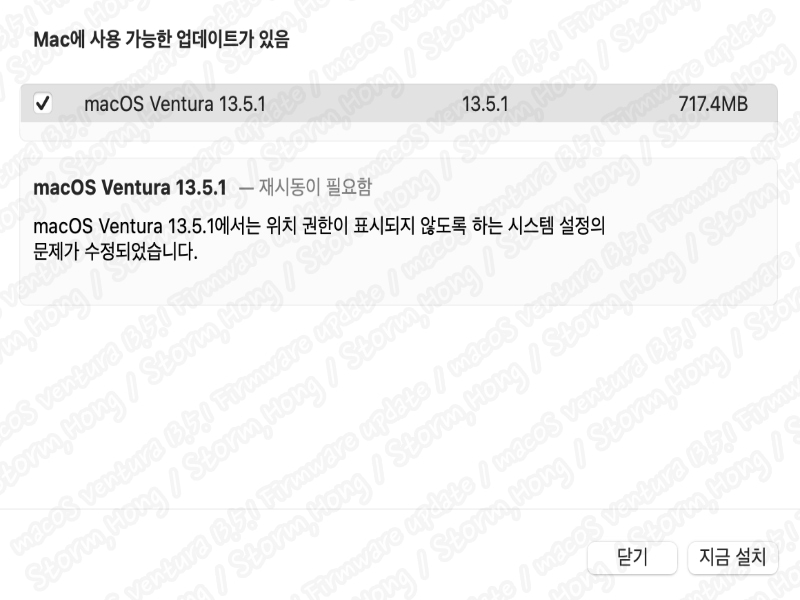 * macOS Ventura 13.5.1 업데이트는 위치 서비스 버그 수정이 있어 진행된 업데이트로 알려졌습니다.