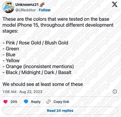 이에 iPhone 15 Series 에서 일반 라인업에 오렌지, 노란색, 로즈 골드, 그리고 몇 가지 다른 색상 옵션을 테스트하고 있다는 예상, 예측, 루머, 소문도 함께 나타났습니다.