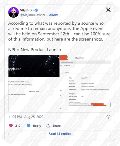 그리고 X(이전 X) 플렛폼을 통해 Majin Bu 는 Tweet 을 통해 Apple 의 행사는 2023년 9월 12일에 iPhone 15 Series, iPhone 15 Pro Series 모델을 출시할 것으로 보인다는 예상, 예측, 루머, 소문의 정보를 전했습니다. 이 날짜 관련 정보는 이전에 공개되었지만, 정확하게 이전 wwdc 2023 처럼 초대장이 발송된 것이 아니기 때문에 지캬봐야 할 것으로 알려졌습니다. 이것이 의미는 iPhone 15 Series 는 더 일찍 또는 나중에 발표하는 것이 적합하다고 볼 수 있을 것이라는 예상, 예측, 루머, 소문의 정보가 있었으나, 예상, 예측, 루머, 소문의 내용으로 다음 주 또는 그 이후에 언론 초대장을 발송하여 iPhone 15 Series 출시 날짜를 정확히 알릴 것으로 보인다는 이야기도 함께 나타났습니다.