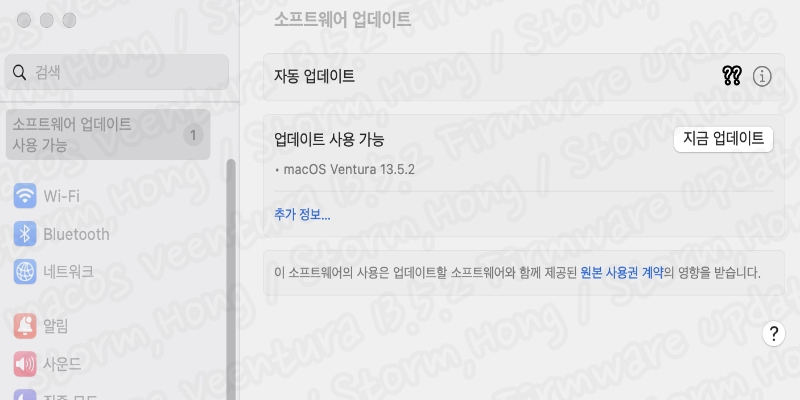 * 업데이트 macOS Venturs 13.5.2 가능 모델 : macOS Ventura 13.X 업데이트가 되어 있는 Mac Pro 2019 이후 모델, iMac Pro 2017 이후 모델 , Mac mini 는 2018 년 후반 이후 모델, MacBook Air 2018년 이후 모델, Macbook 일반 2017년 모델, MacBook Pro 2017년 이후 모델 Mac Studio 2022 모델