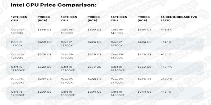 최근 알려진 예상, 예측, 루머, 소문의 정보에 다르면, 가격 리스트는 기존의 13세대 CPU 대비 +15% 가격이 상승할 수 있을 것으로 보입니다. 가격에 대한 예상, 예측, 루머, 소문의 정보에 따르면, intel 이 CPU 가격을 올리기 시작한다면 AMD 라이젠 7000 CPU와 인텔 자체 12세대 및 13세대 부품에 대해서도 경쟁력이 떨어질 수 있을 것으로 보인다는 예상, 예측, 루머, 소문의 정보가 나타났습니다.