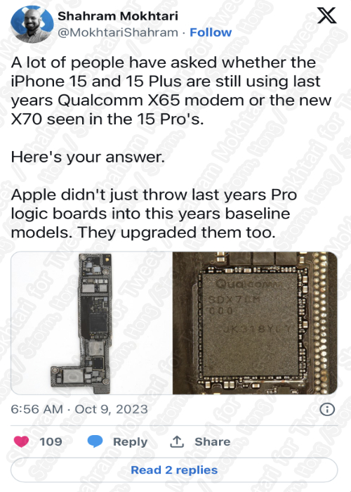 현재 알려진 내용은 iFixit 의 Shahram Mokhtari on X 에서 정보가 공유되었으며, 이는 iPhone 15 Series 에 Qualcomm X70 모뎀이 탑재되어 있음을 시사하는 내용이기도 합니다.