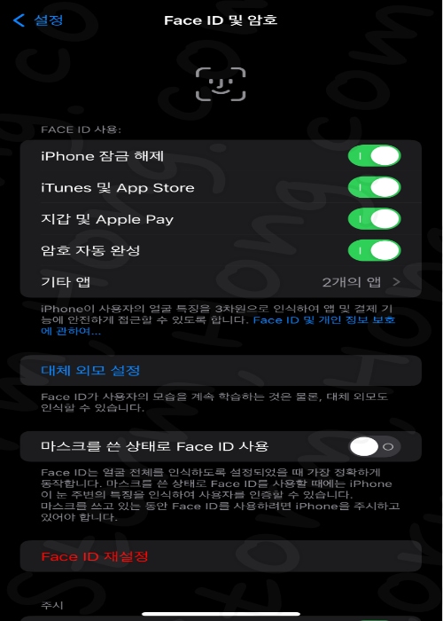 3. Face ID 설정에서 마스크를 쓴 상태로 Face ID 사용 (만약 대체 외모가 설정되어 있다면 새롭게 재설정을 한 후 진행해 주시기 바랍니다.)