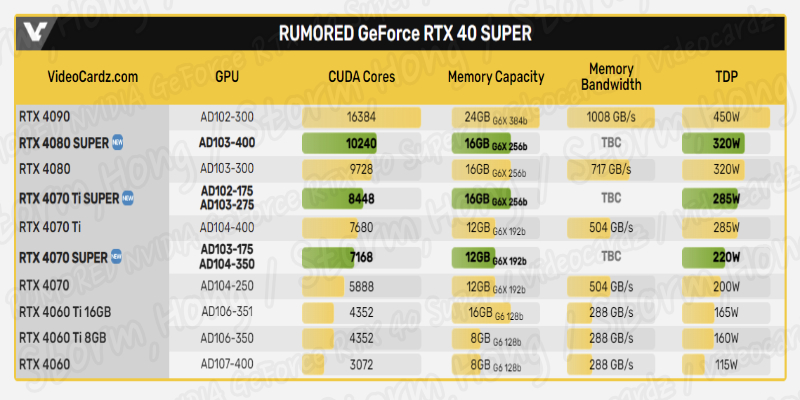 * 동일한 전력으로 더 나은 성능을 보여준다는 것은 NVIDIA GeForce 4000 SUPER GPU 가 개선되거나 최적화된 4N 프로세스 노드를 사용한다는 예상, 예측, 루머, 소문의 정보가 나타나면서, 기존 SKU 에 맞게 조정 및 효율성을 더 높여 생산되어 질 가능성이 있다는, 있다는 예상, 예측, 루머, 소문의 정보이기도 합니다.