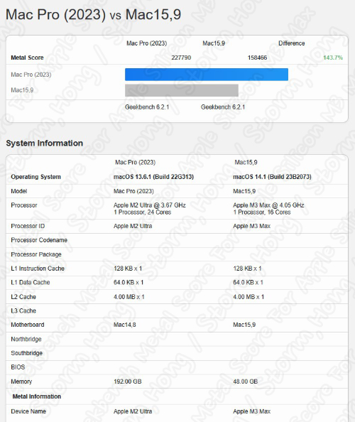 그러나, Apple Silicon M3 Max 는 CPU 중심의 벤치마크에서 좀 더 두각을 나타냈습니다. 즉 Apple silicon M2 Ultra 의 테스트 점수보다 약간 높았으며, GeekBench Metal에서 더 나은 점수를 얻었고, 208,621의 점수를 얻었으며, 두 칩셋 사이에는 차치가 있는 것으로 나타났습니다.