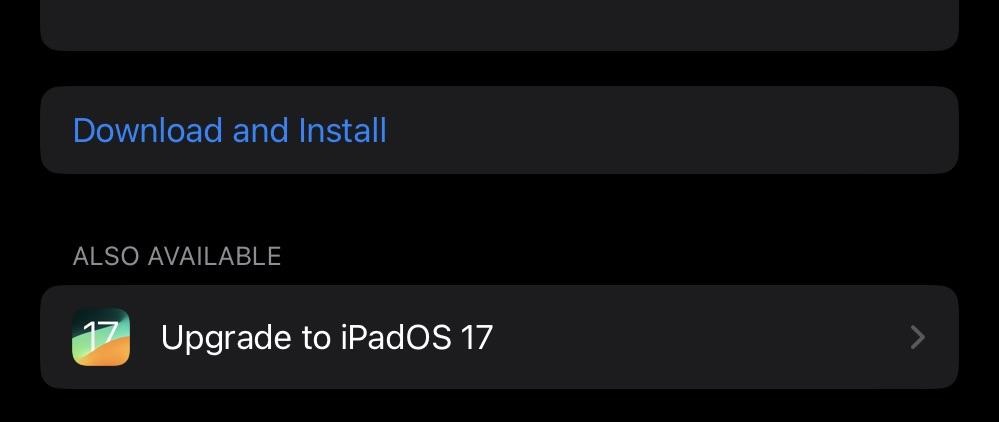 * iPadOS 17.1.1 은 iPadOS 17.1, iPadOS 17.0.3, iPadOS 17.0.2, iPadOS 17.0.1, iPadOS 17, iPadOS 16.7.2 및 16 업데이트 이후 아래와 같이 iPadOS 17 업데이트 메시지가 나타나는 제품에서 업데이트가 가능합니다.