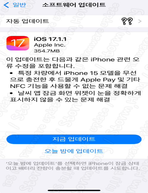 iOS 17.1.1 는 iOS 17.1 이후 업데이트이며, 이번최신 버전 iOS 17.1.1 로 업데이트 되는 기기는iPhone 8 Series 이후 (모델 즉 iPhone 8 Series 는 업데이트 제외) 에서 가능합니다. 또한 iOS 16 Series 에서 업데이트를 하지 않은 경우 아래와 같은 버튼이 아래 활성화 되어 있습니다.