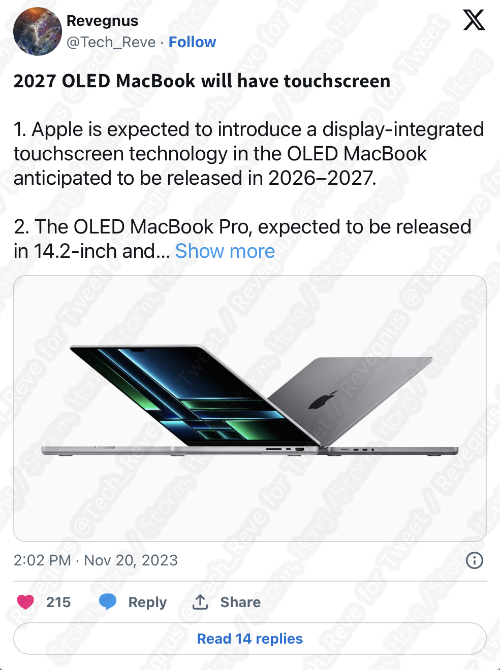 위 정보는 Twitter 를 통해 @Tech_Reve 가 공유한 Tweet 이며, TouchScreen Display (터치스크린 디스플레이) 기술이 적용된 14.2 인치 및 16.2 인치 크기의 OLED MacBook Pro 모델을 출시할 것으로 보인다는 예상, 예측, 루머, 소문의 정보입니다. 팁스터 Revegnus 에 따르면, TouchScreen Display (터치스크린 디스플레이) 는 향후 13.6인치와 15.3인치 모델의 MacBook Air Series 에도 적용될 수 있을지도 모른다는 정보와 함께, 예상, 예측, 루머, 소문으로 나타났습니다. 이는 과거에 그 기술을 통합하는 것을 자제했기 때문이라는 예상, 예측, 루머, 소문의 추측성 정보도 다른 곳에서 나타나고 있습니다.