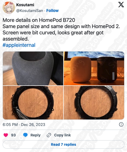 이 HomePod 제품은 향후 버전은 " 코드명 B720 " 으로 알려졌으며, 원래 HomePod 과 동일한 일반 디자인 언어를 갖추고 있는 것으로 보인다는 정보를 전했습니다. 그러나 Smart Speaker 의 상단 부분에는 곡선형 볼록형 LCD 가 위치해 있으며, 컨트롤과 추가 콘텐츠를 표시할 것으로 보인다는 예상, 예측, 루머, 소문의 정보가 나타났습니다. @KosutamiSan 에 의하면, 터치 스크린을 갖춘 프로토타입 HomePod 의 예상, 예측, 루머, 소문에 대한 다양한 부분의 이미지를 공유했습니다. 이 내용 중, 업그레이드된 HomePod에 대한 세부 정보가 있었으며, 알려진 내용은 이번이 처음이 아닌 것으로 알려졌습니다.