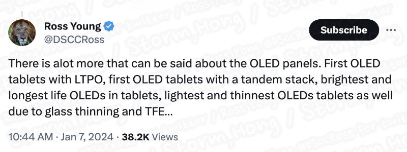 또한 Ross Young 은 자신의 tweet 을 통해서, 알려지고 있는 iPAD Pro 가 '가장 밝고 수명이 긴 OLED' 를 수용할 것이라고 언급했습니다. 이는 탠덤 스택 기술을 사용한 덕분이라는 예상, 예측, 루머, 소문의 정보를 전했습니다.