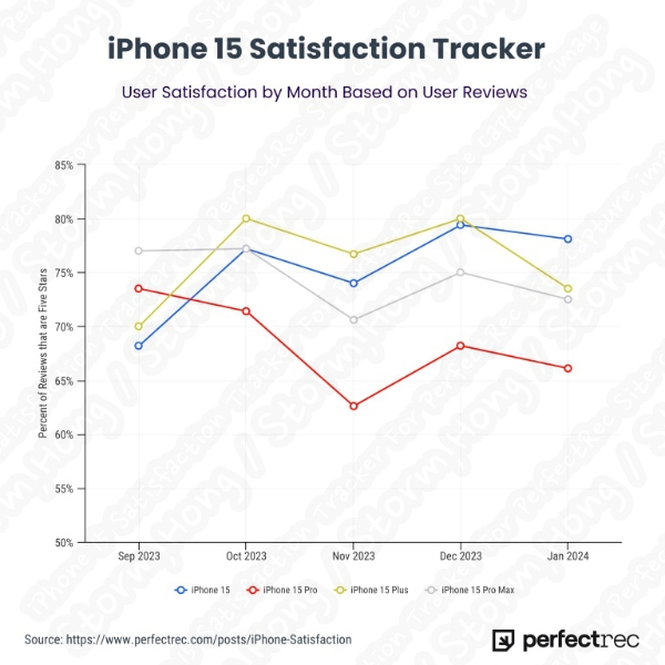 이전 PerfectRec 에서 업데이트한 데이터에 따르면 최신 iPhone 15 Pro 는 이전에 출시된 프리미엄 iPhone 모델 보다도 가장 낮은 고객 만족도를 기록한 것으로 알려졌습니다. 이에 별 5개 등급은 2023년 10월 부터 68% 로 감소한 것으로 보인다는 정보가 나타났습니다.