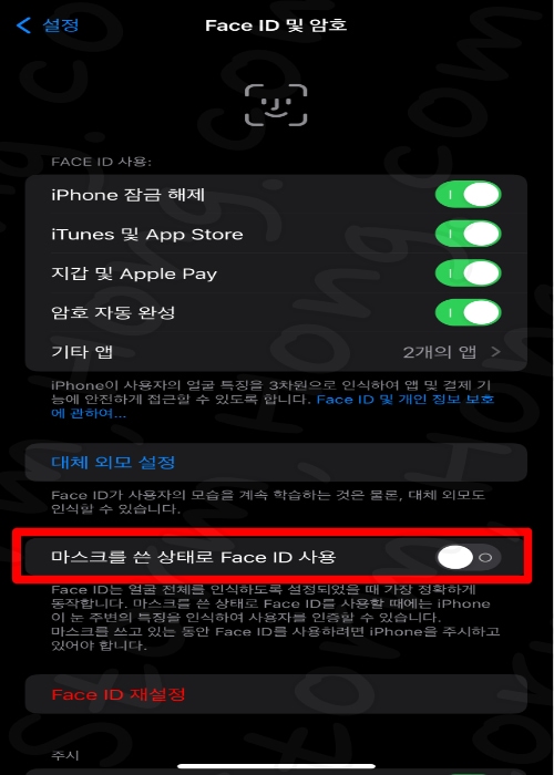 3. Face ID 설정에서 마스크를 쓴 상태로 Face ID 사용 (만약 대체 외모가 설정되어 있다면 새롭게 재설정을 한 후 진행해 주시기 바랍니다.)