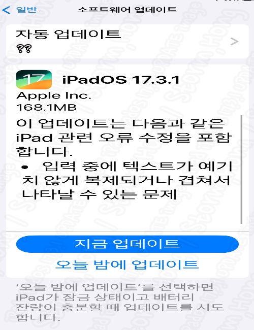 iPadOS 17.3.1 이하 업데이트를 하지 않은 분들은 다른 iOS 16 버전 등과 마찬가지로 여러 버전이 포함되어 iPadOS 17.3.1 업데이트 용량이 더 클 수 있습니다. 먼저 업데이트 전에 확인해 주시기 바랍니다.'
