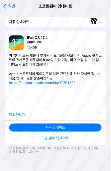iPadOS 17.4 이하 업데이트를 하지 않은 분들은 다른 iOS 16 버전 등과 마찬가지로 여러 버전이 포함되어 iPadOS 17.4 업데이트 용량이 더 클 수 있습니다. 먼저 업데이트 전에 공간을 확인해 주시기 바랍니다.'