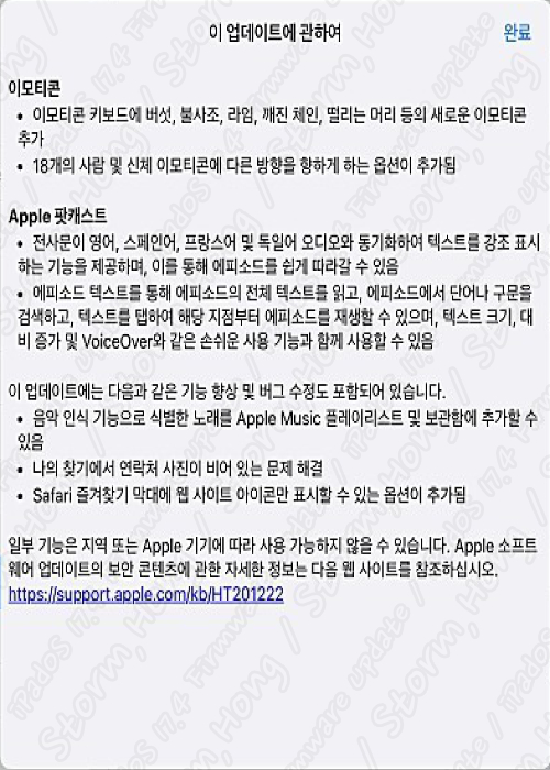 애플 보안 사이트 문서의 내용은 Apple은 고객 보호를 위해 보안 문제에 관한 조사를 마치고 패치 또는 출시 버전을 일반에 공개할 수 있을 때까지는 보안 문제를 공개하거나, 논의하거나, 확인해 주지 않습니다. 이 문서에는 최신 출시 버전이 나와 있습니다. 이를 통해 자신에 맞는 기기 업데이트 버전 설명 찾아보시기 바랍니다.