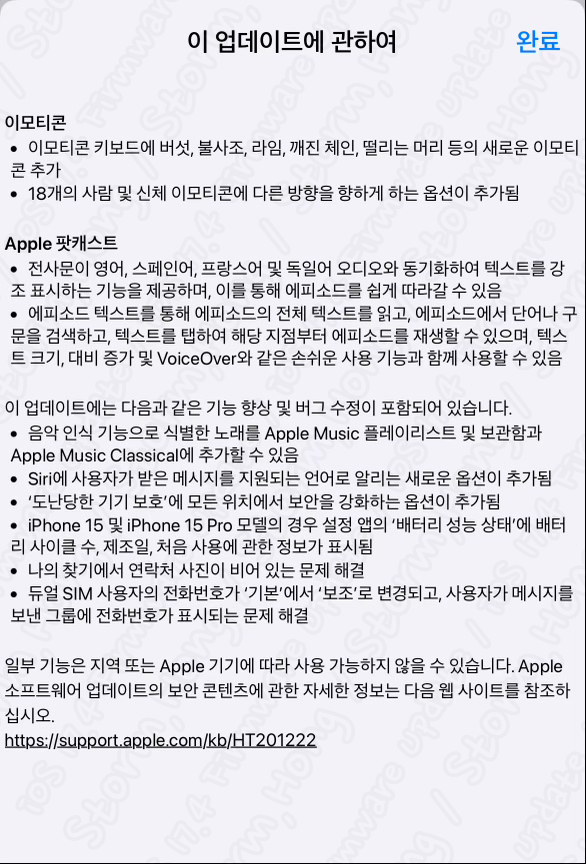 * iOS 17.4 업데이트 가능 모델 : iPhone XS 이후 (모델 즉 iPhone 8 Series , iPhone X 업데이트 제외) 에서 가능합니다.