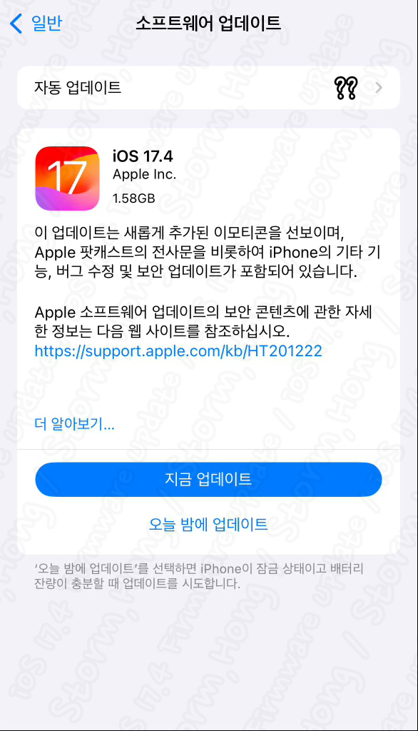iOS 17.4 은 iOS 17.3.1 이후 업데이트이며, 이번최신 버전 iOS 17.4 로 업데이트 되는 기기는iPhone XS 이후 (모델 즉 iPhone 8 Series 는 업데이트 제외) 에서 가능합니다. 또한 iOS 16 Series 에서 업데이트를 하지 않은 경우 아래와 같은 버튼이 아래 활성화 되어 있습니다.