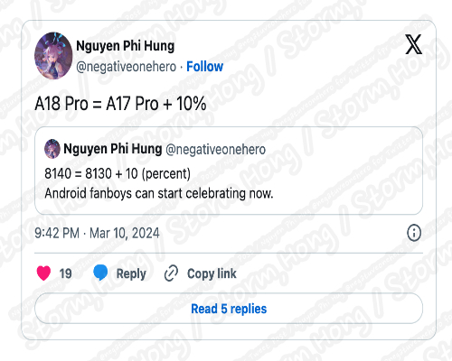 Twitter (즉 X) 사용자 @negativeonehero 는 자신의 Tweet 을 통해 두 칩셋 (A18 Bionic , A17 Bionic) 의 멀티 코어 결과에 대한 Tweet 피드벡 답글에 A18 Pro의 성능은 'A17 Pro + 10%' 로 정보를 전했으며, A18 Pro 의 일부 세부 예상, 예측, 루머, 소문의 정보를 전했습니다. 그 정보에서 A18 Pro 는 Geekbench 6 테스트 점수가 8,000 점보다 약간 더 높은 점수를 가질 것으로 보인다는 의미일 수 있으며, 이는 아직 자세한 정보가 아니지만 Apple 에서 새롭게 출시할 것으로 알려진 Apple Silicon 제품이 Snapdragon 8 Gen 4, Dimensity 9400 제품으로 알려진 것과 경쟁한다면 상황은 달라질 수 있을 것으로 보인다는 예상, 예측, 루머, 소문의 정보도 함께 알려졌습니다. 즉 A18 Pro Bionic 과 A17 Pro Bionic 비교 점수를 보면 2024년 하반기 Android 기반 스마트폰 시장과 격돌할 것으로 보인다는 정보도 나온 만큼 Android OS를 탑재한 제품군에 반가운 소식이 될 수 있을 것으로 보인다는 정보가 나타났습니다.