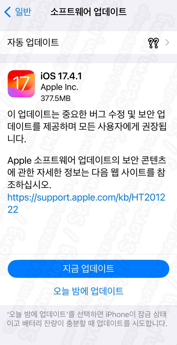 iOS 17.4.1은 iOS 17.4 이후 업데이트이며, 이번최신 버전 iOS 17.4.1 로 업데이트 되는 기기는iPhone XS 이후 (모델 즉 iPhone 8 Series 는 업데이트 제외) 에서 가능합니다. 또한 iOS 16 Series 에서 업데이트를 하지 않은 경우 아래와 같은 버튼이 아래 활성화 되어 있습니다.