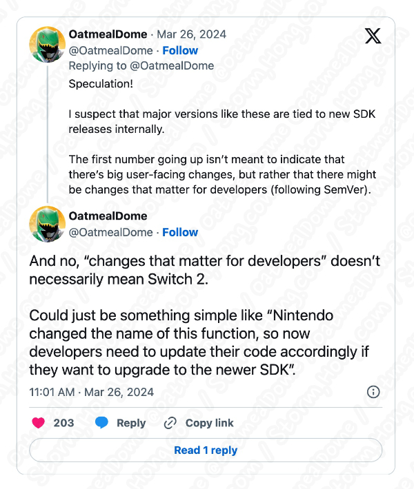 내용으로는 새로운 펌웨어 버전은 스위치의 "나쁜 단어" 목록을 업데이트하여 특정 남성 신체 부위로 시작하는 단어로 모든 입력을 차단 및 Switch Update 18.0.0 은 기본적으로 모든 시스템 구성 요소에 대한 업데이트를 팩을 제공한다고 합니다. 그리고, 'OatMealDome' 는 Tweet 을 통해 이번 시스템 업데이트가 사용자에게 보이는 것보다 개발자에게 더 중요할 수 있다는 정보를 전했습니다. 그러나 이 내용이 예상, 예측, 루머, 소문으로 나오고 있는 출시가 예상, 예측, 루머, 소문으로 알려지고 있는 닌텐도 스위치 2 (Nintendo Switch 2) 모델과 관련이 있다는 것을 의미하는 것은 아니라고 설명했습니다.