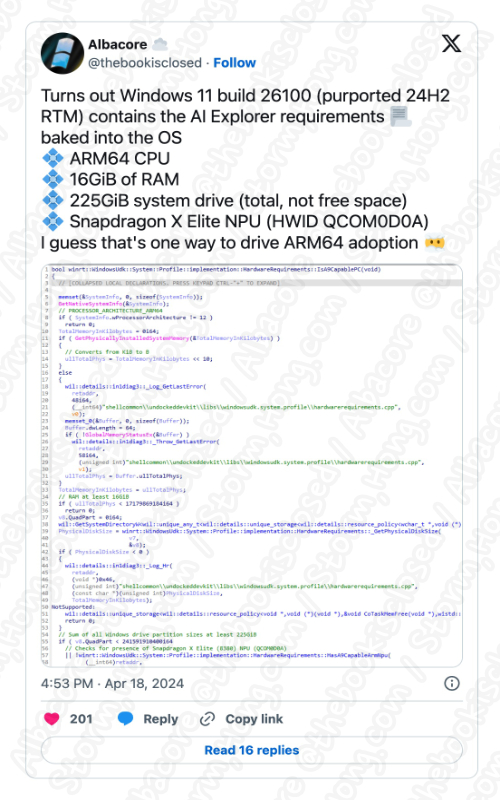 Twitter 사용자 Albacore 에 따르면, Windows 11 (윈도우 11) 버전 24H2 소스 코드에는 AI Explorer (익스플로러) 의 잠재적인 시스템 요구 사항을 암시하는 주석이 포함되어 있다는 새로운 정보에 대해 예상, 예측, 루머, 소문의 정보를 전했습니다. XDA에 따르면 이러한 요구 사항 중 하나는 Snapdragon X Elite 와 16 GB RAM 및 225 GB 의 여유 저장 공간이 있는 것으로 알려졌으며, 더 많은 RAM 과 스토리지를 얻는 것은 어려운 일이 아니지만, 다양한 노트북 제조업체들은 곧 Snapdragon X Elite 버전을 공개할 것으로 보인다는 예상, 예측, 루머, 소문의 정보가 나타났으며, 이 기계들만이 AI Explorer (익스플로러) 를 실행할 수 있는 것으로 알려졌습니다.