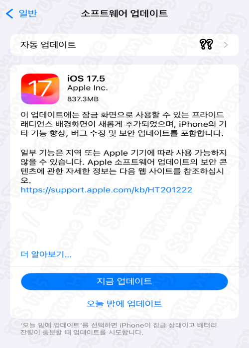 iOS 17.5 은 iOS 17.4.1 이후 업데이트이며, 이번최신 버전 iOS 17.5 로 업데이트 되는 기기는iPhone XS 이후 (모델 즉 iPhone 8 Series 는 업데이트 제외) 에서 가능합니다. 또한 iOS 16 Series 에서 업데이트를 하지 않은 경우 아래와 같은 버튼이 아래 활성화 되어 있습니다.