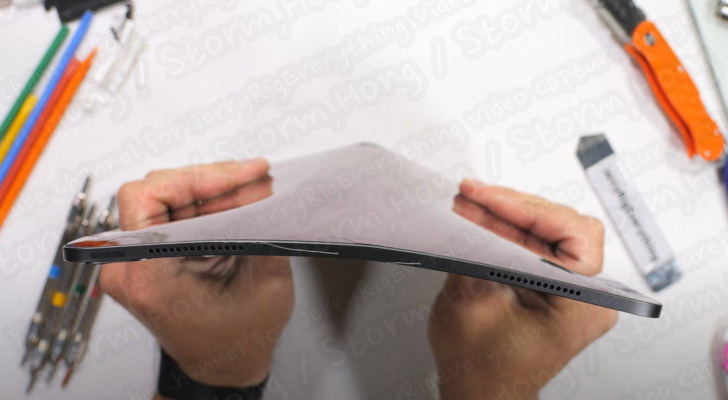 이처럼 우려 속에 Apple 경영진은 보호용 카울링이 최신 태블릿에 구조적 견고함을 제공한다는 이야기를 했음에도 불구하고, 사람들은 이에 앞서 말한 것과 같이 의구심을 가지고 있었습니다. 그중 휘어짐과 내구성을 진행한 한 유튜버에 의해 이에 대한 정보가 나타났습니다. 그 내용 중 중앙이 아닌 충전 위치에서 휘어짐과 부서짐에 대한 테스트 정보를 보여주었습니다. 그 자세한 내용은 다음과 같습니다.