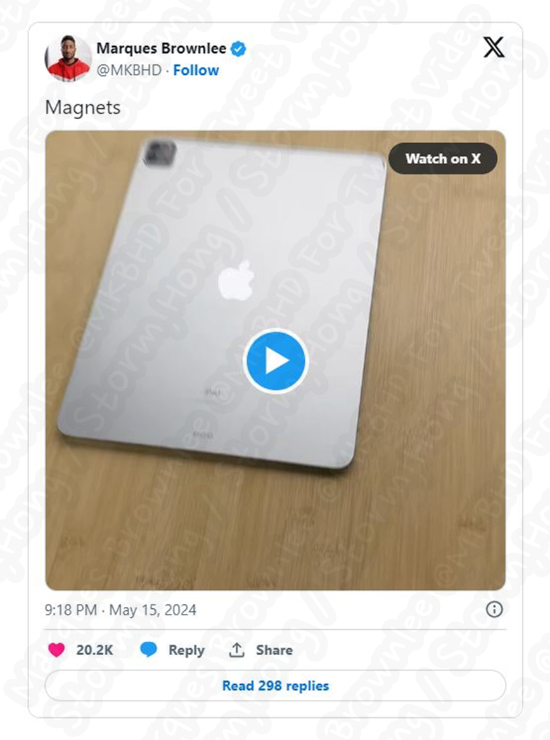 * Youtuber MKBHD 는 이전 iPad Pro와 새로운 OLED iPad Series 의 자석을 비교하기 위해 자석 종이를 사용했습니다. 이를 통해, 무게 외에도 새로운 자석을 사용하였으며, 제품은 자석 모양뿐만 아니라 더 ‘입방체’ 라는 정보를 전했습니다.