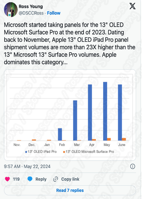 그러나 출시에 있어, 몇 달의 차이이며, Apple Display 출하량은 서피스프로보다 23배 이상 높은 것으로 알려졌습니다. 따라서 13 M4 ipad Pro 도 증가할 것으로 보인다는 예상, 예측, 루머, 소문의 정보가 나타났습니다.