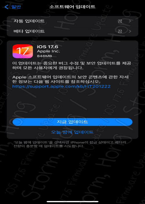 iOS 17.6 은 iOS 17.5.1 이후 업데이트이며, 이번최신 버전 iOS 17.6 로 업데이트되는 기기는iPhone XS 이후 (모델 즉 iPhone 8 Series 는 업데이트 제외) 에서 가능합니다. 또한 iOS 16 Series 에서 업데이트를 하지 않은 경우 아래와 같은 버튼이 아래 활성화되어 있습니다.