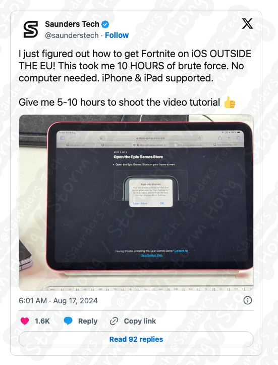 [ 한 iPad 소유자, EU 외부에 거주시, 포트나이트 실행하는 방법이 있다? 주장, 실행 방법에 대한 전체 튜토리얼을 게시할 것이라는 주장을 Tweet 에 계시 ]