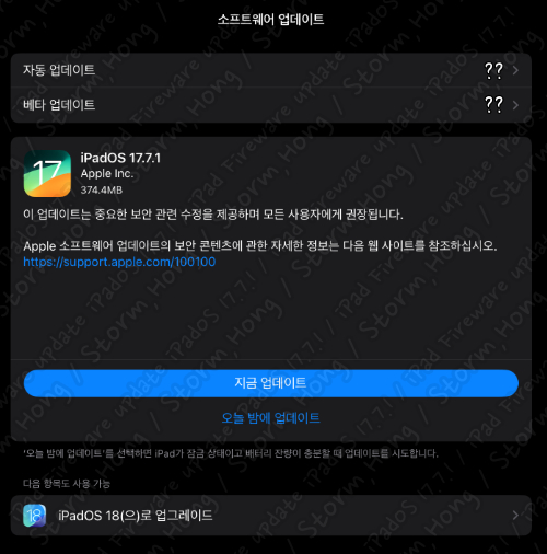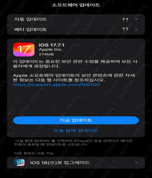 * 즉 iOS 17.7.1 , iPadOS 17.7.1 은 iOS 18, iPadOS 18 업데이트를 하지 않는 iOS 17 이상, iPadOS 17 이상의 OS 버전이 업데이트된 분들이 진행하는 업데이트입니다.