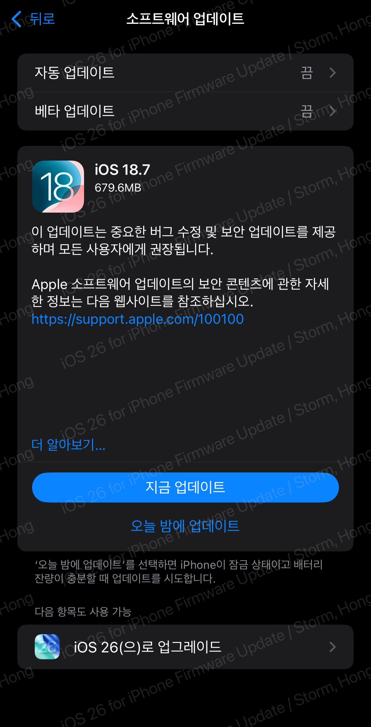 ↓아래와 같이 최신 iOS 26 업데이트가 나타는 경우, 더 이상 iOS 18.7 업데이트를 할 수 없습니다.