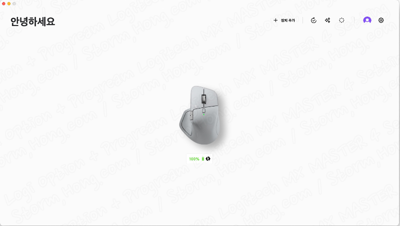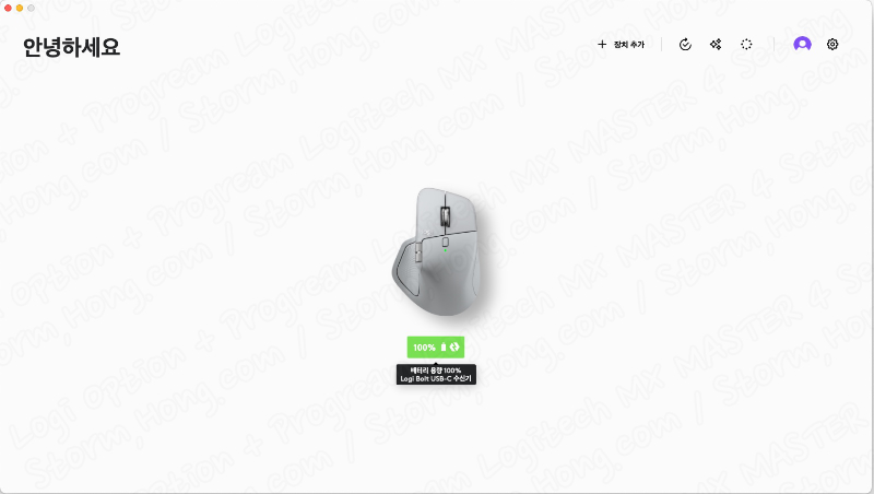 가장 먼저 세팅을 마치고 나면, Logitech MX MASTER Series (로지텍 MX MASTER 시리즈) 의 어떤 제품을 사용하고 있는지, 연결된 제품의 모양과 배터리 잔량이 표시되어 있습니다.